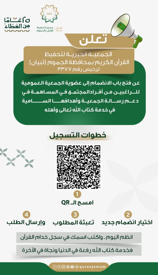 تعلن الجمعية الخيرية لتحفيظ القرآن الكريم بمحافظة الجموم (تبيان) ترخيص رقم ٣٣٧٧