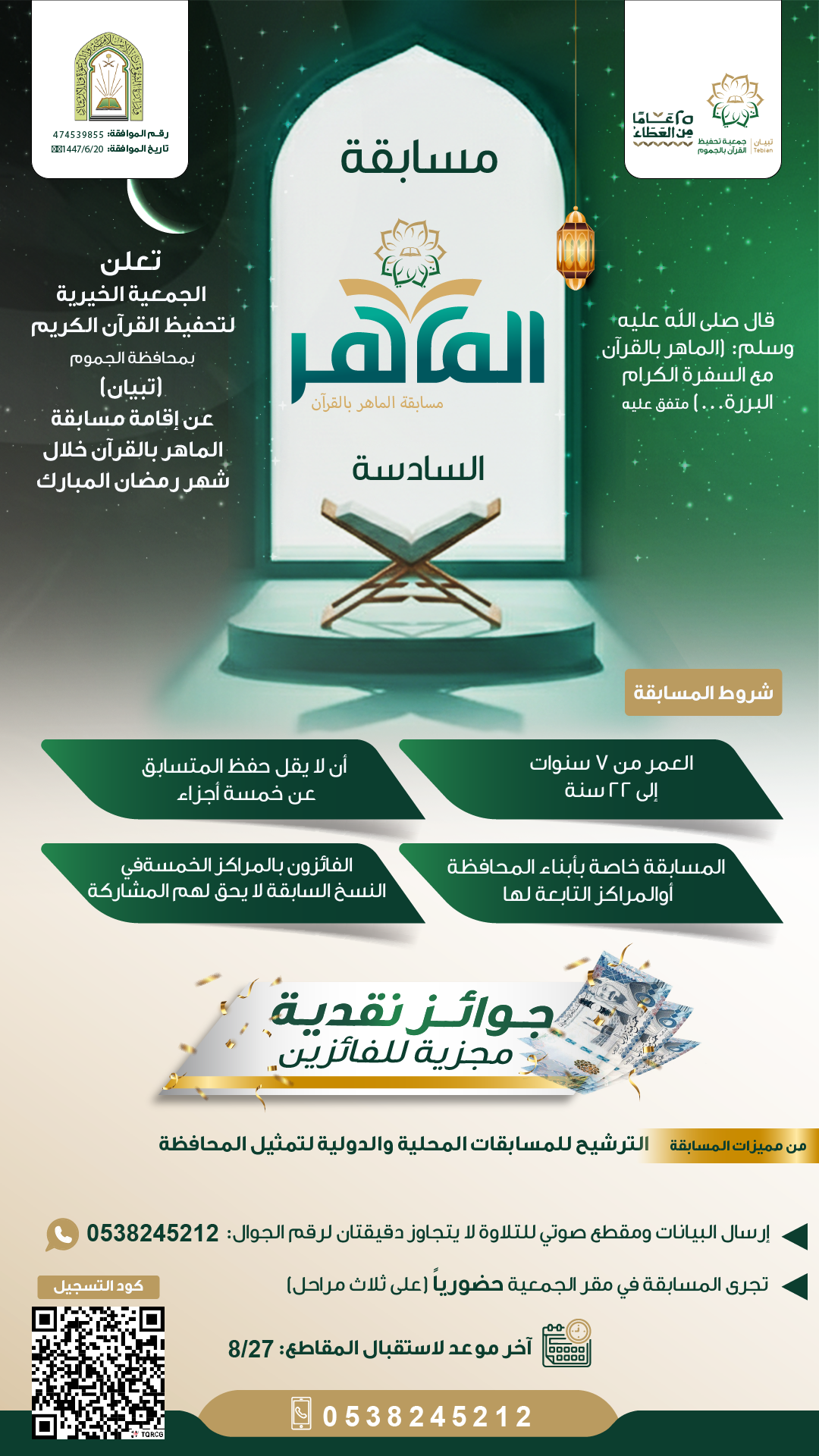 اعلان بدأ التسجيل في مسابقة الماهر بالقرآن السادسة تعلن الجمعية الخيرية لتحفيظ القرآن الكريم بمحافظة الجموم (تبيان) عن مسابقة الماهر بالقرآن – النسخة السادسة خلال شهر رمضان المبارك ترشيح للمسابقات المحلية والدولية للفئة العمرية من 7 إلى 22 سنة آخر موعد لاستقبال المقاطع: 27 / 8 للتواصل: 0538245212 مشاركة طلاب وطالبات تبيان في مسابقة الملك سلمان لحفظ القرآن الكريم